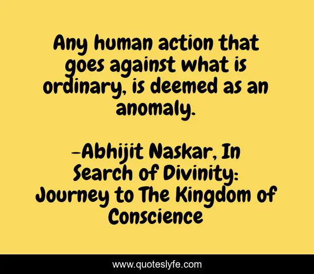 This page presents the quote "Any human action that goes against what is ordinary, is deemed as an anomaly.". Author of this quote is Abhijit Naskar, In Search of Divinity: Journey to The Kingdom of Conscience. This quote is about social-psychology, inspiring, brainy, human-behavior, neuropsychology, inspiration, social-issues, human-nature, social-behavior,.