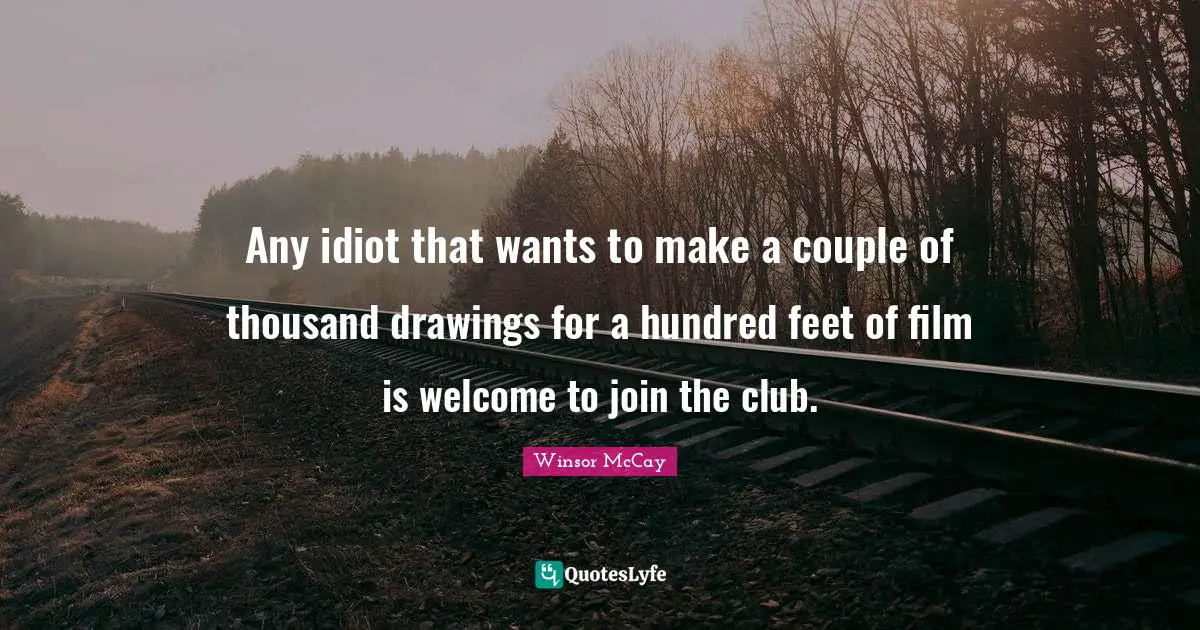 This page presents the quote "Any idiot that wants to make a couple of thousand drawings for a hundred feet of film is welcome to join the club.". Author of this quote is Winsor McCay. This quote is about couple, feet, welcome, hundred, thousand, film, idiot, drawing,.