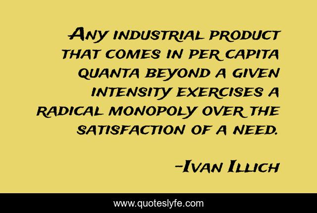 This page presents the quote "Any industrial product that comes in per capita quanta beyond a given intensity exercises a radical monopoly over the satisfaction of a need.". Author of this quote is Ivan Illich. .