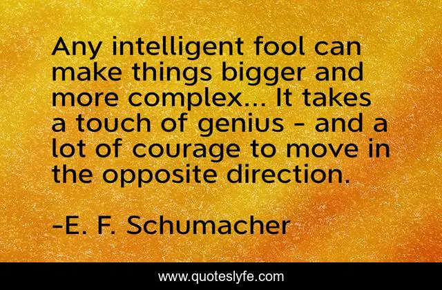 This page presents the quote "Any intelligent fool can make things bigger and more complex... It takes a touch of genius - and a lot of courage to move in the opposite direction.". Author of this quote is E. F. Schumacher. This quote is about fool, genius, intelligent,.