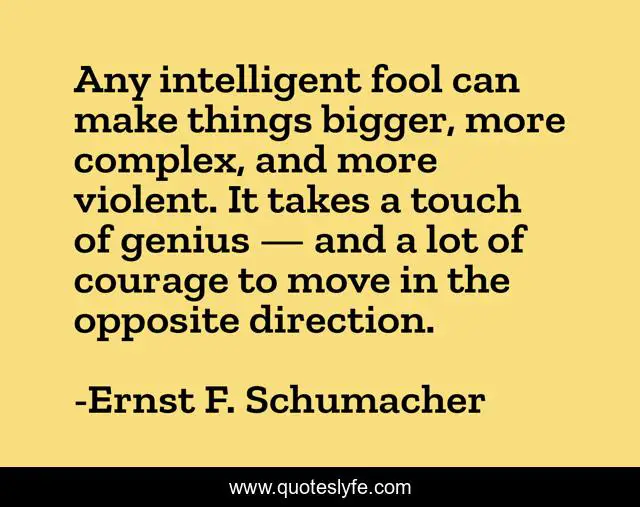This page presents the quote "Any intelligent fool can make things bigger, more complex, and more violent. It takes a touch of genius — and a lot of courage to move in the opposite direction.". Author of this quote is Ernst F. Schumacher. This quote is about simplicity, violence, elegance, genius, complexity, inspirational, enthusiasm,.