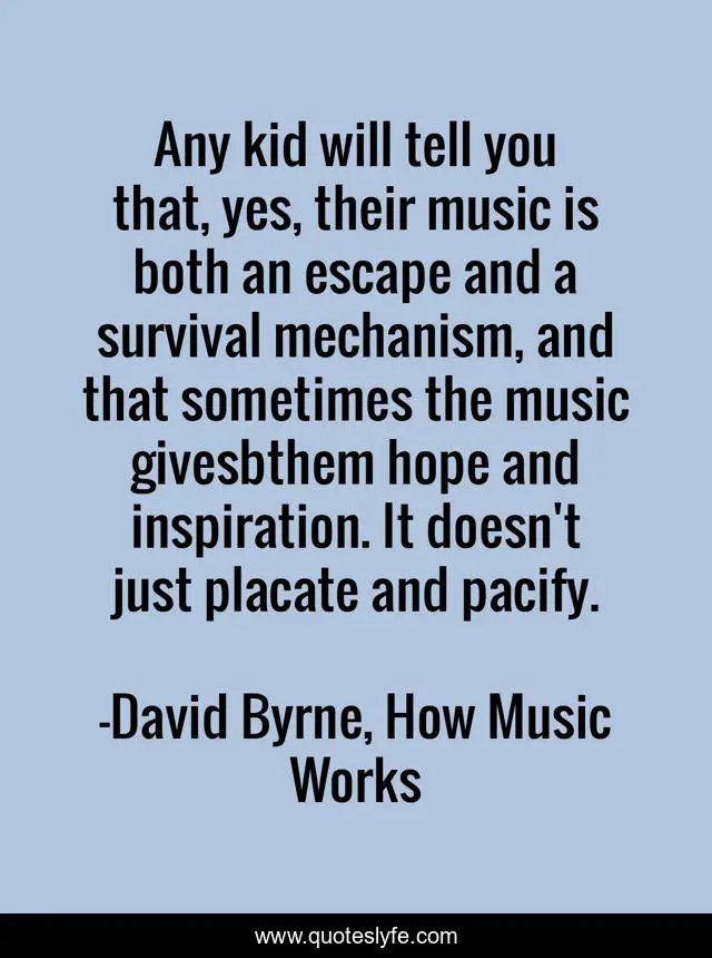 This page presents the quote "Any kid will tell you that, yes, their music is both an escape and a survival mechanism, and that sometimes the music givesbthem hope and inspiration. It doesn't just placate and pacify.". Author of this quote is David Byrne, How Music Works. This quote is about music, teenagers, hope, inspiration,.
