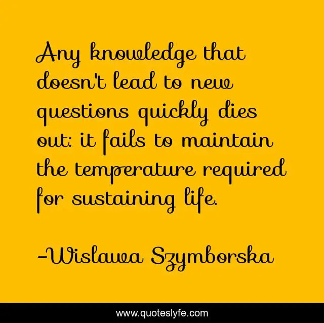 This page presents the quote "Any knowledge that doesn't lead to new questions quickly dies out: it fails to maintain the temperature required for sustaining life.". Author of this quote is Wislawa Szymborska. This quote is about new, life, questions,.