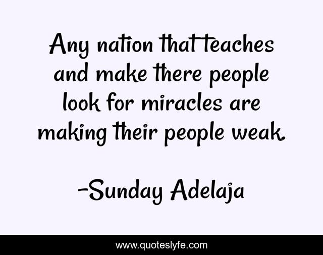 This page presents the quote "Any nation that teaches and make there people look for miracles are making their people weak.". Author of this quote is Sunday Adelaja. This quote is about miracles, teachings, nation, miracle, people,.