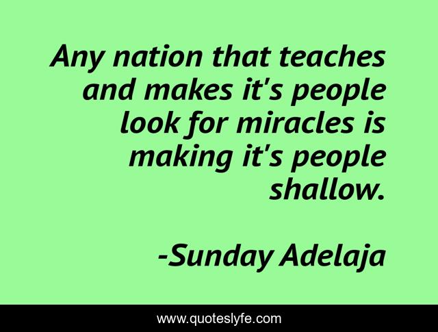 This page presents the quote "Any nation that teaches and makes it's people look for miracles is making it's people shallow.". Author of this quote is Sunday Adelaja. This quote is about miracles, national-teachings, miracle, shallowness, desperation,.