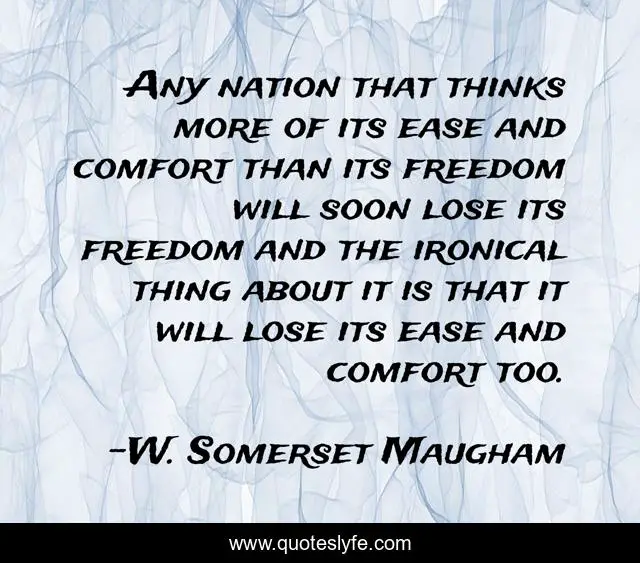 This page presents the quote "Any nation that thinks more of its ease and comfort than its freedom will soon lose its freedom and the ironical thing about it is that it will lose its ease and comfort too.". Author of this quote is W. Somerset Maugham. This quote is about comfort, nation,.