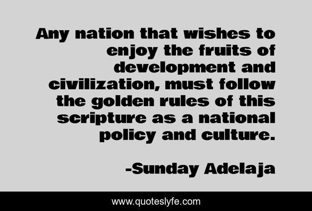 This page presents the quote "Any nation that wishes to enjoy the fruits of development and civilization, must follow the golden rules of this scripture as a national policy and culture.". Author of this quote is Sunday Adelaja. This quote is about development, enjoy, scriptures, golden, rules, national, nation, culture, as,.