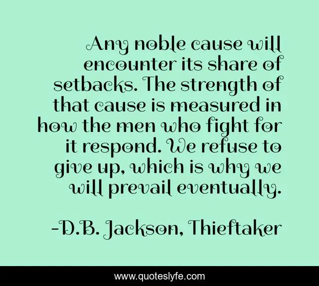 This page presents the quote "Any noble cause will encounter its share of setbacks. The strength of that cause is measured in how the men who fight for it respond. We refuse to give up, which is why we will prevail eventually.". Author of this quote is D.B. Jackson, Thieftaker. This quote is about cause, strength, character, nobility,.