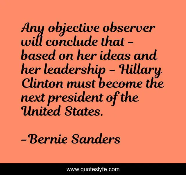 This page presents the quote "Any objective observer will conclude that - based on her ideas and her leadership - Hillary Clinton must become the next president of the United States.". Author of this quote is Bernie Sanders. This quote is about president, ideas, her,.