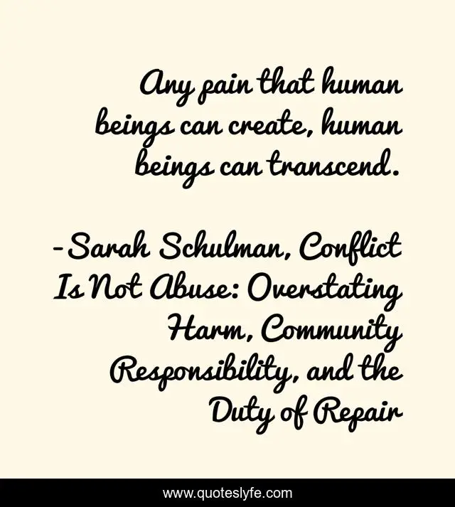 "Sarah Schulman, Conflict Is Not Abuse: Overstating Harm, Community Responsibility, and the Duty of Repair Quotes." Quoteslyfe.com, 2025. Mon. 08 Dec. 2025. <https://www.quoteslyfe.com/quote/Any-pain-that-human-beings-can-create-75724>.