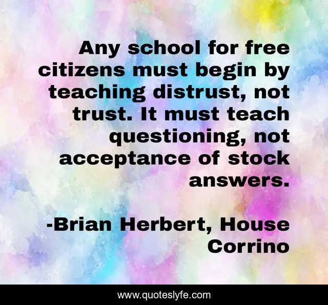 This page presents the quote "Any school for free citizens must begin by teaching distrust, not trust. It must teach questioning, not acceptance of stock answers.". Author of this quote is Brian Herbert, House Corrino. This quote is about teaching, knowledge,.