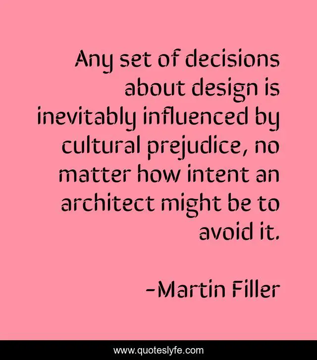 This page presents the quote "Any set of decisions about design is inevitably influenced by cultural prejudice, no matter how intent an architect might be to avoid it.". Author of this quote is Martin Filler. This quote is about decisions, prejudice, matter,.