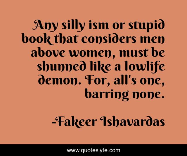 Any silly ism or stupid book that considers men above women, must be shunned like a lowlife demon. For, all's one, barring none.