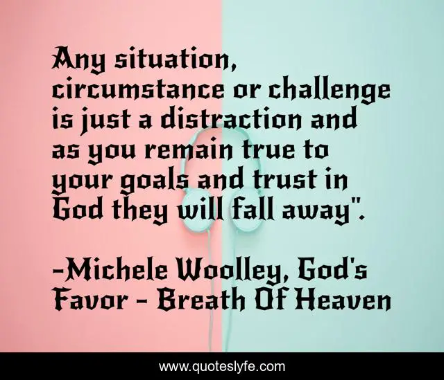 This page presents the quote "Any situation, circumstance or challenge is just a distraction and as you remain true to your goals and trust in God they will fall away".". Author of this quote is Michele Woolley, God's Favor - Breath Of Heaven. This quote is about miracles, faith, christian, favor, self-help, self-esteem,.