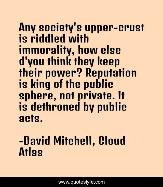 This page presents the quote "Any society's upper-crust is riddled with immorality, how else d'you think they keep their power? Reputation is king of the public sphere, not private. It is dethroned by public acts.". Author of this quote is David Mitchell, Cloud Atlas. This quote is about society, reputation, public, private, morality,.