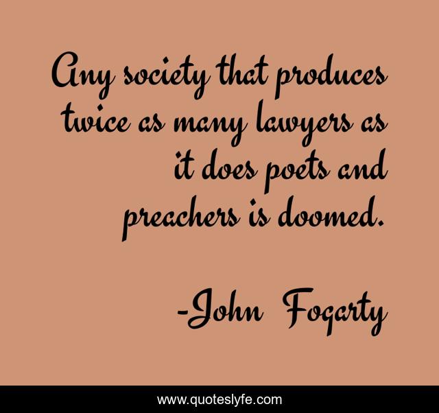 This page presents the quote "Any society that produces twice as many lawyers as it does poets and preachers is doomed.". Author of this quote is John Fogarty. This quote is about quote, poets, lawyers, philosophy-of-people,.