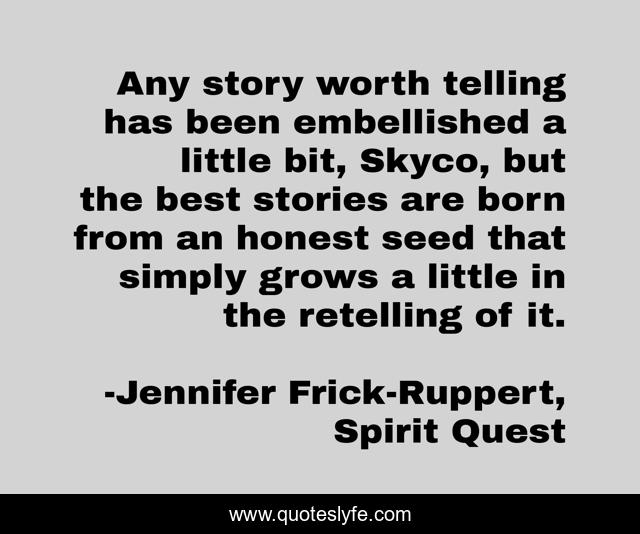 This page presents the quote "Any story worth telling has been embellished a little bit, Skyco, but the best stories are born from an honest seed that simply grows a little in the retelling of it.". Author of this quote is Jennifer Frick-Ruppert, Spirit Quest. This quote is about embellishment, story-telling, native-american, story, embellish, honest, stories, native-american-wisdom, grows,.