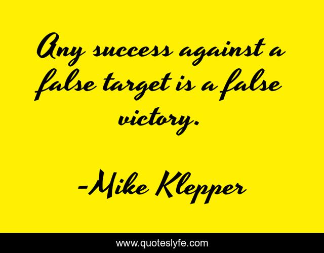 This page presents the quote "Any success against a false target is a false victory.". Author of this quote is Mike Klepper. This quote is about success, false-victory, false-target, meaningless-things, defeat, victory,.