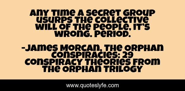 This page presents the quote "Any time a secret group usurps the collective will of the people, it’s wrong. Period.". Author of this quote is James Morcan, The Orphan Conspiracies: 29 Conspiracy Theories from The Orphan Trilogy. This quote is about justice, clandestine, secret-societies,.