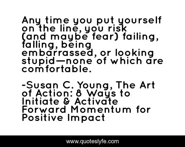 This page presents the quote "Any time you put yourself on the line, you risk (and maybe fear) failing, falling, being embarrassed, or looking stupid—none of which are comfortable.". Author of this quote is Susan C. Young, The Art of Action: 8 Ways to Initiate & Activate Forward Momentum for Positive Impact. This quote is about relationship, communication-skills, emotional-intelligence, positive-first-impression, quotes-by-susan-c-young, initiative, motivational-speaker-susan-young, susanspeaks-com, bravery,.