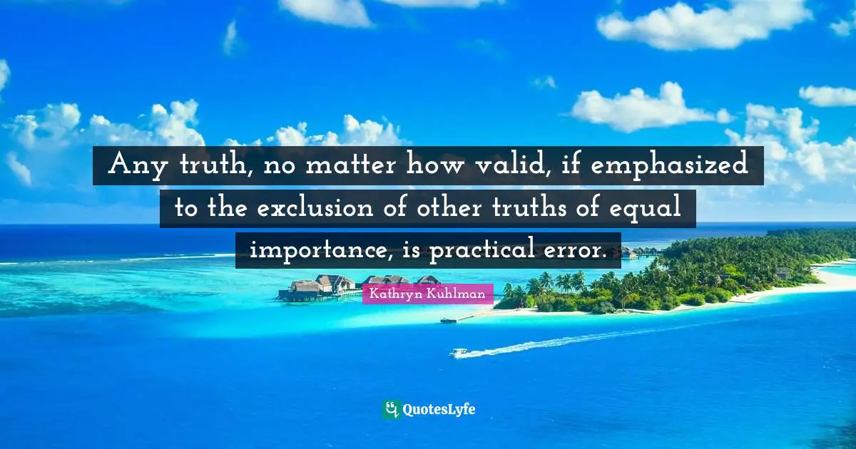 This page presents the quote "Any truth, no matter how valid, if emphasized to the exclusion of other truths of equal importance, is practical error.". Author of this quote is Kathryn Kuhlman. This quote is about exclusion, truth, matter, importance, equal, errors,.