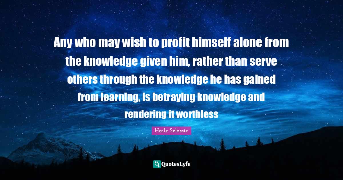 This page presents the quote "Any who may wish to profit himself alone from the knowledge given him, rather than serve others through the knowledge he has gained from learning, is betraying knowledge and rendering it worthless". Author of this quote is Haile Selassie. This quote is about knowledge, wish, given, rendering, may, learning, profit, worthless,.
