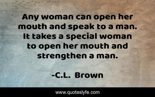 This page presents the quote "Any woman can open her mouth and speak to a man. It takes a special woman to open her mouth and strengthen a man.". Author of this quote is C.L. Brown. This quote is about inspirational, love, relationship, affection, enthusiasm,.