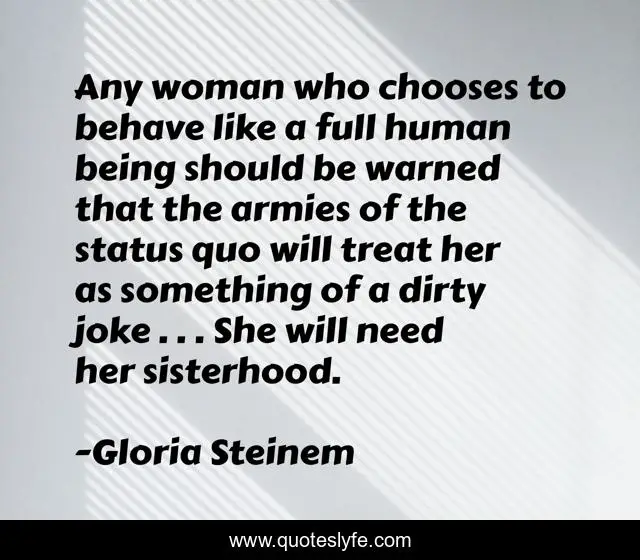 This page presents the quote "Any woman who chooses to behave like a full human being should be warned that the armies of the status quo will treat her as something of a dirty joke . . . She will need her sisterhood.". Author of this quote is Gloria Steinem. This quote is about sisterhood, feminism, women,.