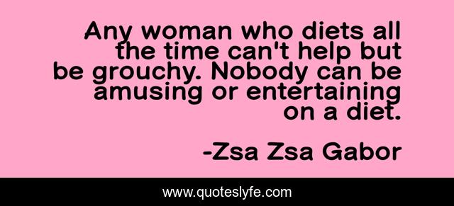 This page presents the quote "Any woman who diets all the time can't help but be grouchy. Nobody can be amusing or entertaining on a diet.". Author of this quote is Zsa Zsa Gabor. This quote is about woman, help, time,.
