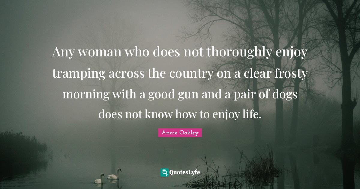 This page presents the quote "Any woman who does not thoroughly enjoy tramping across the country on a clear frosty morning with a good gun and a pair of dogs does not know how to enjoy life.". Author of this quote is Annie Oakley. This quote is about enjoy, clear, country, enjoy life, know how, dog, gun, friendship, morning,.