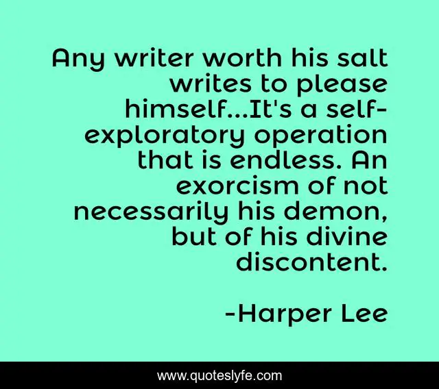 This page presents the quote "Any writer worth his salt writes to please himself...It's a self-exploratory operation that is endless. An exorcism of not necessarily his demon, but of his divine discontent.". Author of this quote is Harper Lee. .