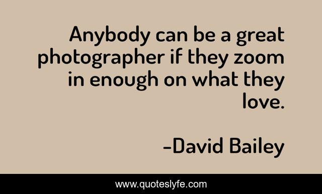 This page presents the quote "Anybody can be a great photographer if they zoom in enough on what they love.". Author of this quote is David Bailey. This quote is about photographer, enough, love, affection,.