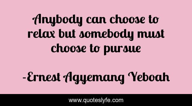 This page presents the quote "Anybody can choose to relax but somebody must choose to pursue". Author of this quote is Ernest Agyemang Yeboah. This quote is about success, pursue, relaxed, giving-up, achievement-and-attitude, vision,.