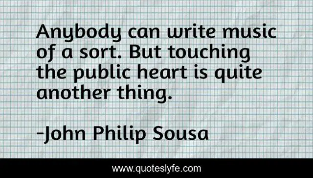 This page presents the quote "Anybody can write music of a sort. But touching the public heart is quite another thing.". Author of this quote is John Philip Sousa. This quote is about write, heart, public,.