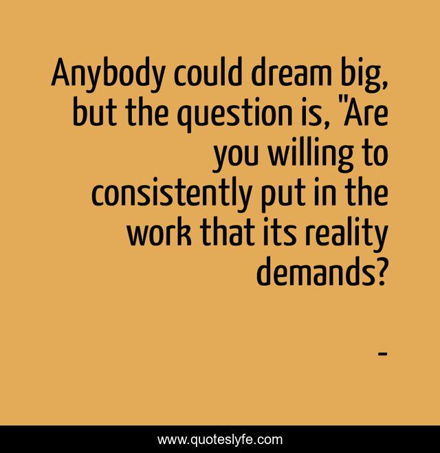 This page presents the quote "Anybody could dream big, but the question is, "Are you willing to consistently put in the work that its reality demands?". Author of this quote is . This quote is about edmond-mbiaka, dream-big, dreaming-big,.