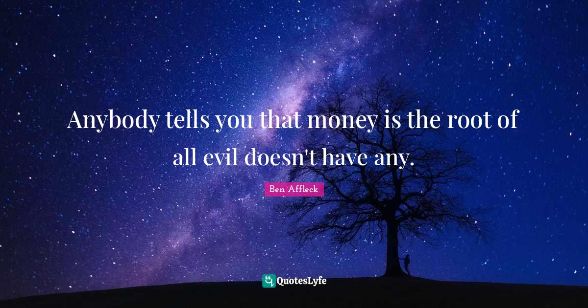 This page presents the quote "Anybody tells you that money is the root of all evil doesn't have any.". Author of this quote is Ben Affleck. This quote is about money, roots, boiler room, evil,.