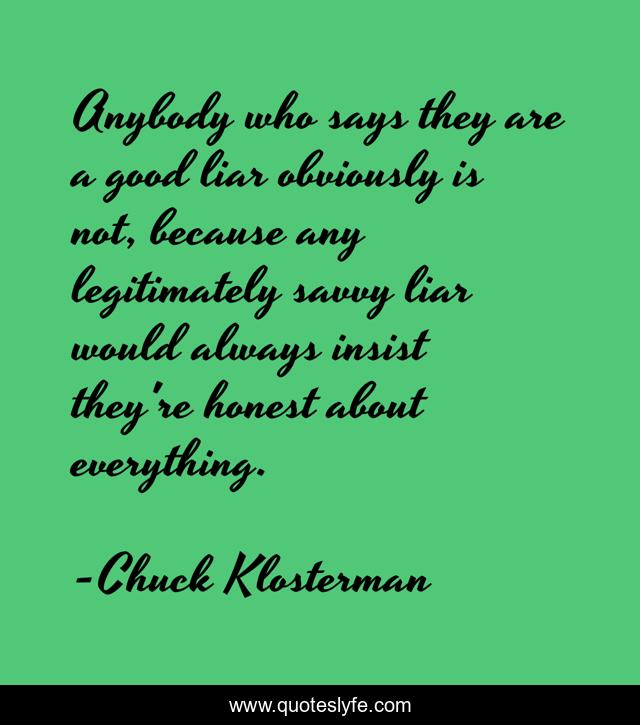 This page presents the quote "Anybody who says they are a good liar obviously is not, because any legitimately savvy liar would always insist they're honest about everything.". Author of this quote is Chuck Klosterman. This quote is about humor, self-assessment, liar, lying,.