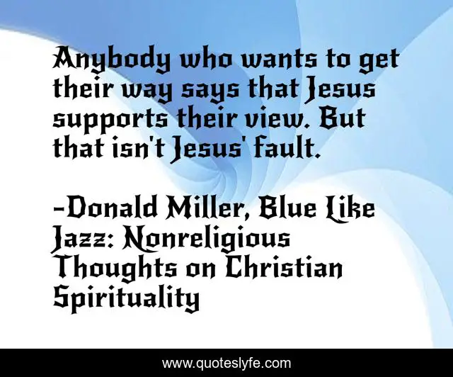 This page presents the quote "Anybody who wants to get their way says that Jesus supports their view. But that isn't Jesus' fault.". Author of this quote is Donald Miller, Blue Like Jazz: Nonreligious Thoughts on Christian Spirituality. This quote is about faith, jesus, christianity, religion,.