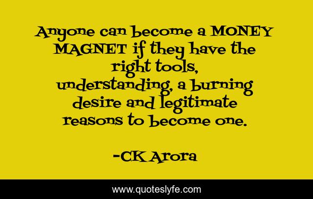 This page presents the quote "Anyone can become a MONEY MAGNET if they have the right tools, understanding, a burning desire and legitimate reasons to become one.". Author of this quote is CK Arora. This quote is about money, inspirational, enthusiasm,.