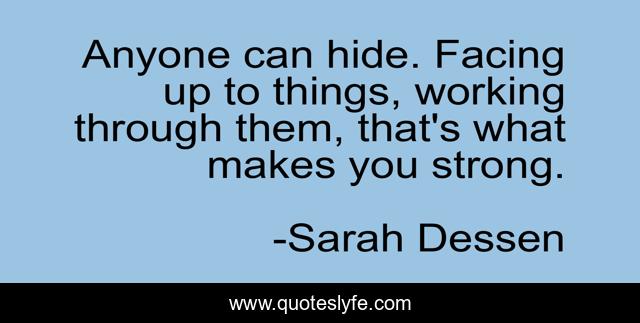 This page presents the quote "Anyone can hide. Facing up to things, working through them, that's what makes you strong.". Author of this quote is Sarah Dessen. This quote is about enthusiasm, strength, tough-times, inspirational,.