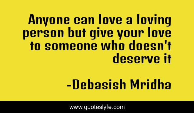 This page presents the quote "Anyone can love a loving person but give your love to someone who doesn't deserve it". Author of this quote is Debasish Mridha. This quote is about life, love, knowledge, inspirational, intelligence, philosophy, wisdom, quotes, affection,.