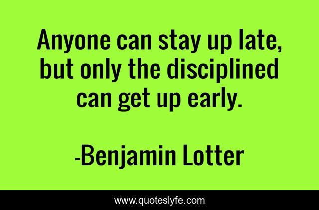 This page presents the quote "Anyone can stay up late, but only the disciplined can get up early.". Author of this quote is Benjamin Lotter. .