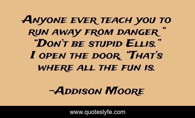 This page presents the quote "Anyone ever teach you to run away from danger ” “Don’t be stupid Ellis.” I open the door. “That’s where all the fun is.". Author of this quote is Addison Moore. .