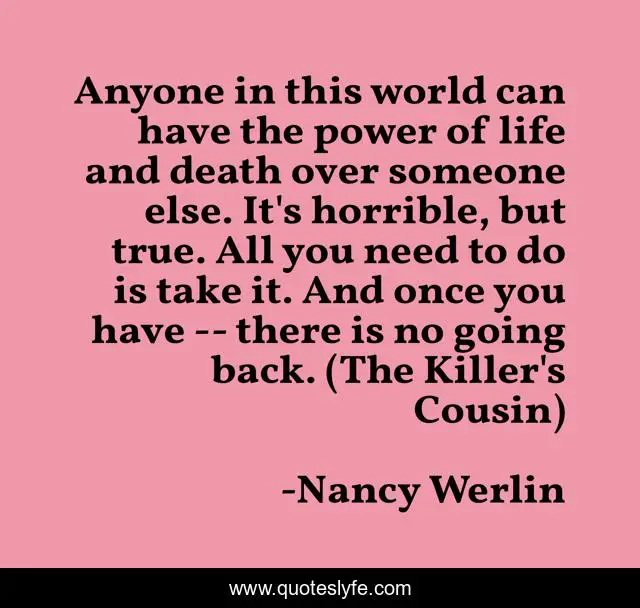 This page presents the quote "Anyone in this world can have the power of life and death over someone else. It's horrible, but true. All you need to do is take it. And once you have -- there is no going back. (The Killer's Cousin)". Author of this quote is Nancy Werlin. This quote is about life, death,.