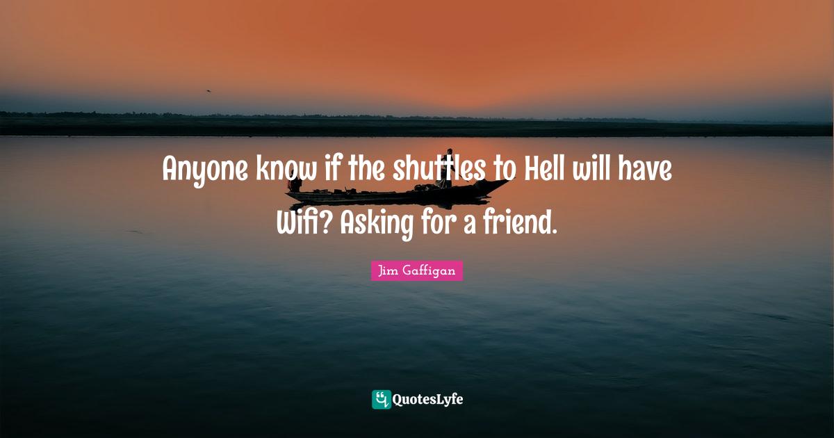 This page presents the quote "Anyone know if the shuttles to Hell will have Wifi? Asking for a friend.". Author of this quote is Jim Gaffigan. This quote is about hell, knows, asking,.
