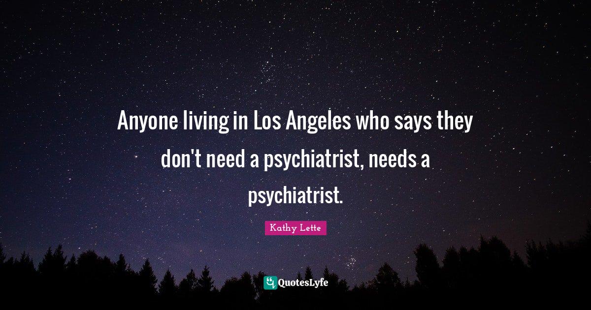 This page presents the quote "Anyone living in Los Angeles who says they don't need a psychiatrist, needs a psychiatrist.". Author of this quote is Kathy Lette. This quote is about psychiatrist, los angeles, needs,.