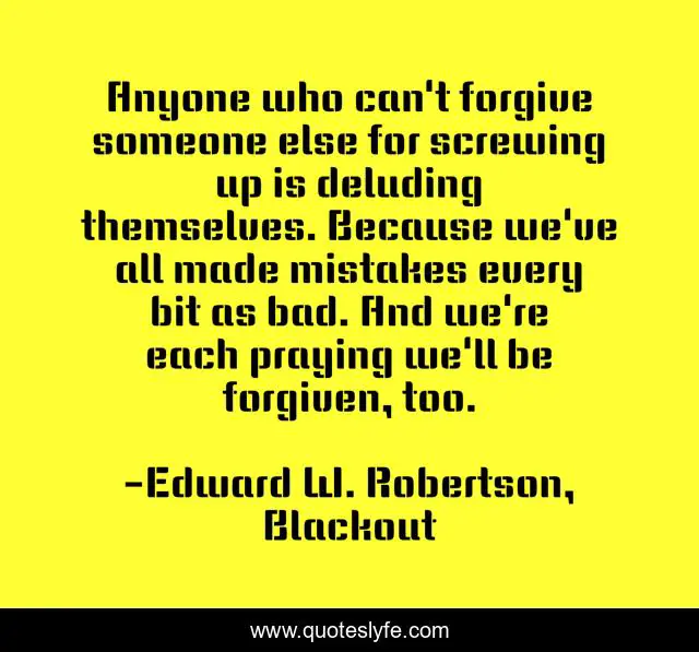 This page presents the quote "Anyone who can't forgive someone else for screwing up is deluding themselves. Because we've all made mistakes every bit as bad. And we're each praying we'll be forgiven, too.". Author of this quote is Edward W. Robertson, Blackout. This quote is about mistakes, forgiveness,.