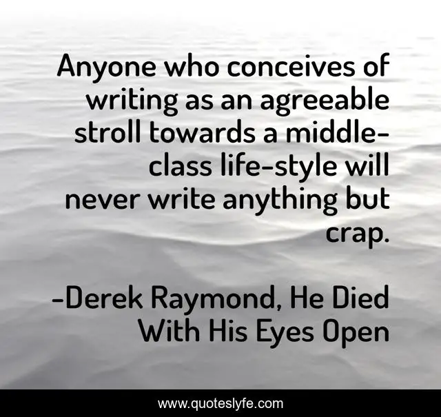 This page presents the quote "Anyone who conceives of writing as an agreeable stroll towards a middle-class life-style will never write anything but crap.". Author of this quote is Derek Raymond, He Died With His Eyes Open. .