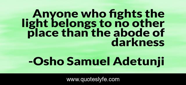 This page presents the quote "Anyone who fights the light belongs to no other place than the abode of darkness". Author of this quote is Osho Samuel Adetunji. This quote is about light, greatness, victory, darkness,.