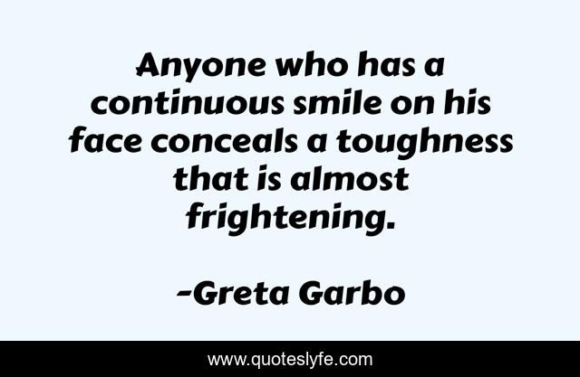 This page presents the quote "Anyone who has a continuous smile on his face conceals a toughness that is almost frightening.". Author of this quote is Greta Garbo. This quote is about smile, mask, toughness, happiness, feelings,.